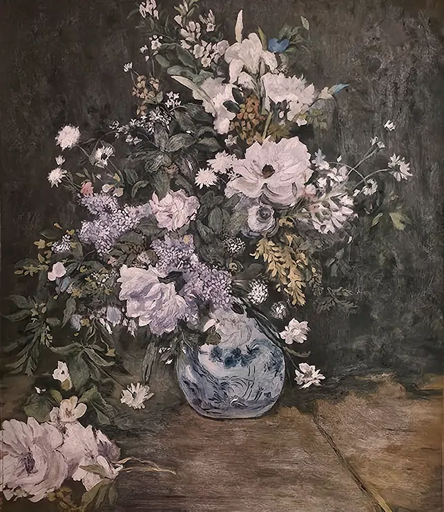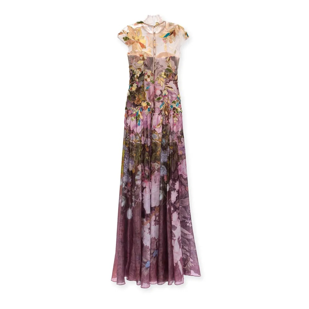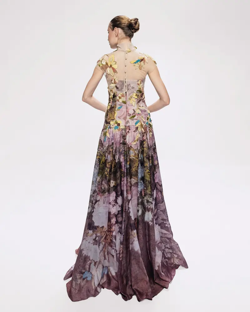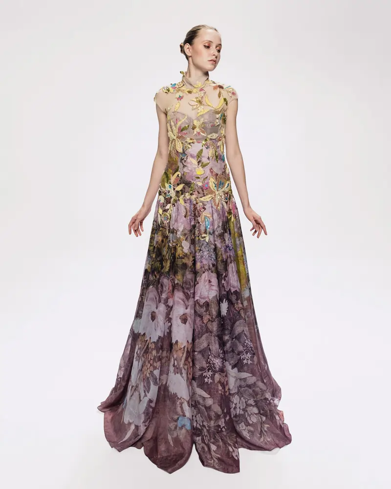 A dress, crafted from luxurious silk, is a masterpiece of construction and imagination. The standout print from Shikha’s original painting of a Renoir merges impressionism and avante-garde fashion. The Indian workmanship embroidered on the silhouette is bold and sophisticated.